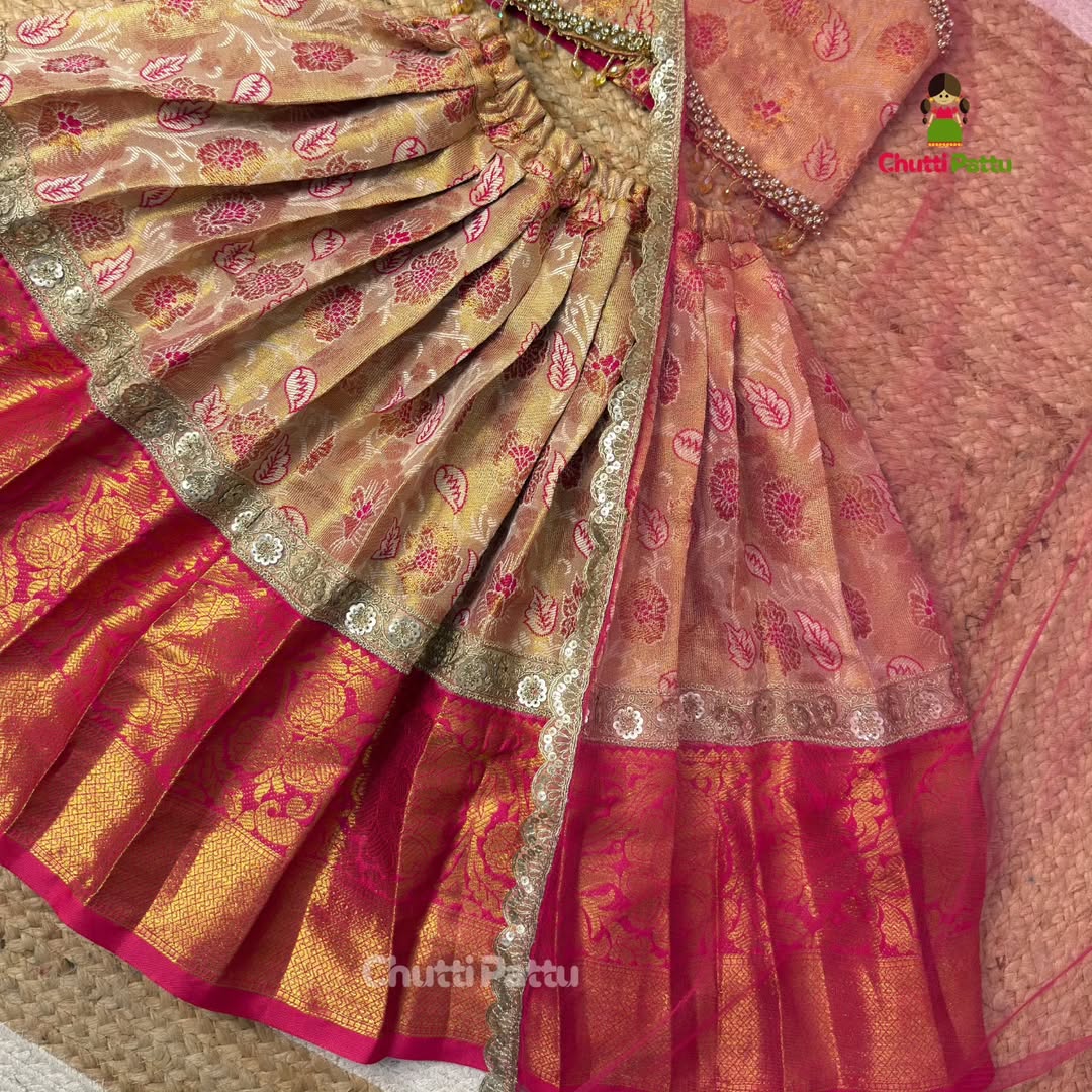 πΈ Cream & Pink Kanchi Tissue Set π with Handwork πͺ‘, Tassels π & Shawl π§£ Beautiful cream and Pink colour combo π€ Item Code: CPM_0393 Fabric: Semi kanchi tissue silk πͺ» Pink with a touch of cream colourπ β¨ Hand work lace given on blouse β¨ π Hanging Beads: Elegant beads on the blouse to elevate the glam π« Kanchi Tissue Sil
