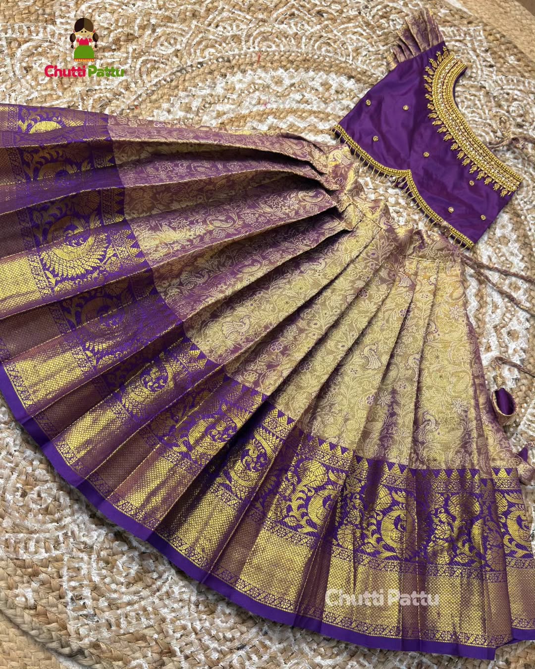 π Royal Grace β¨ | One-Shoulder Aari Pattu Pavadai in Semi Kanchi Tissue Silk πͺ» Launching most beautiful purple π One shoulder elegant aari pattu pavadai ππ₯° Item Code:CPM_0403 FABRIC: Semi Kanchi Tissue Silk πβ¨ Blouse: One shoulder crop top, with grand aari work in neck portion with cute hanging beads π Skirt: The super