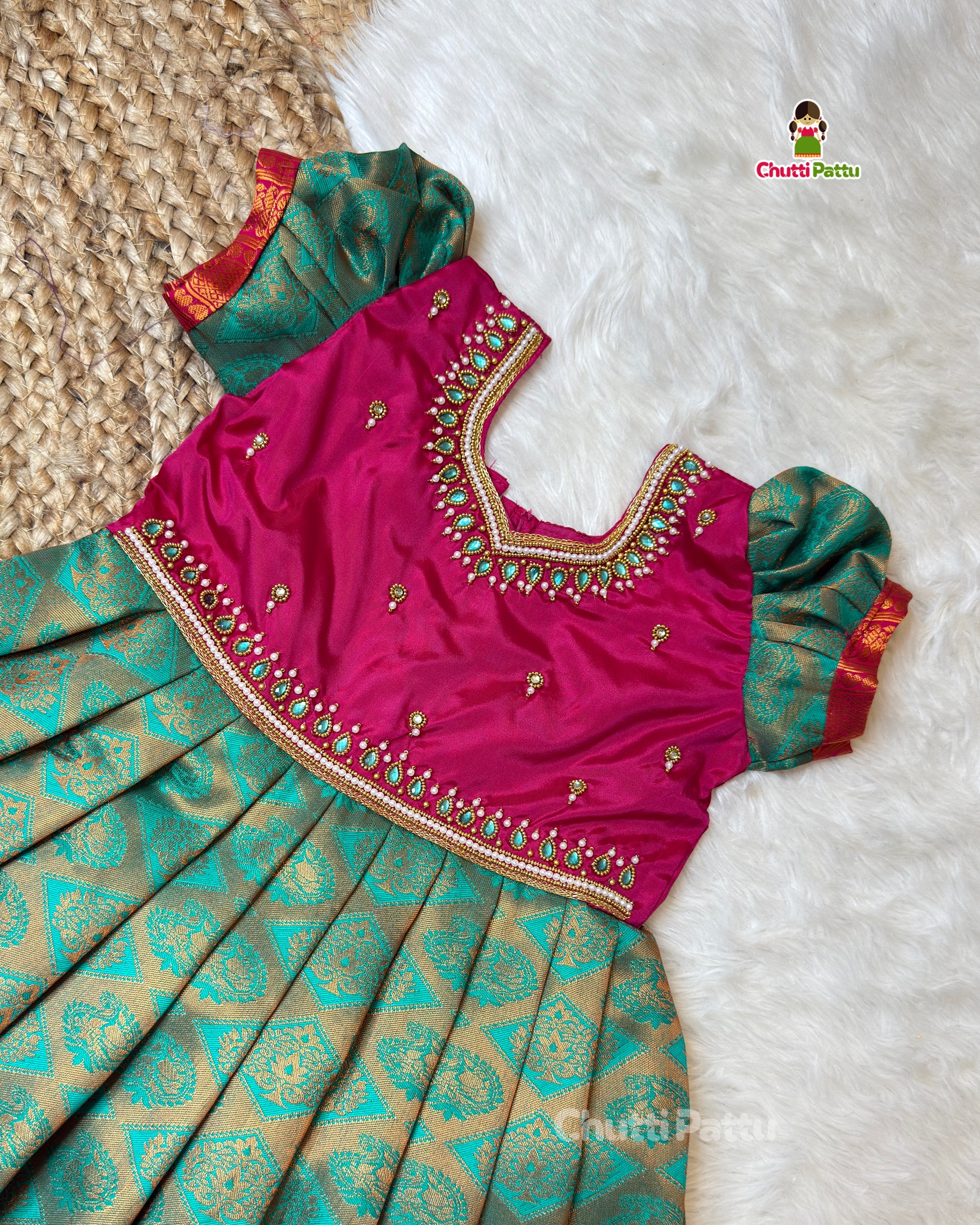 ππ Light Teal Green & Magenta Aari Half Saree Style Gown β¨