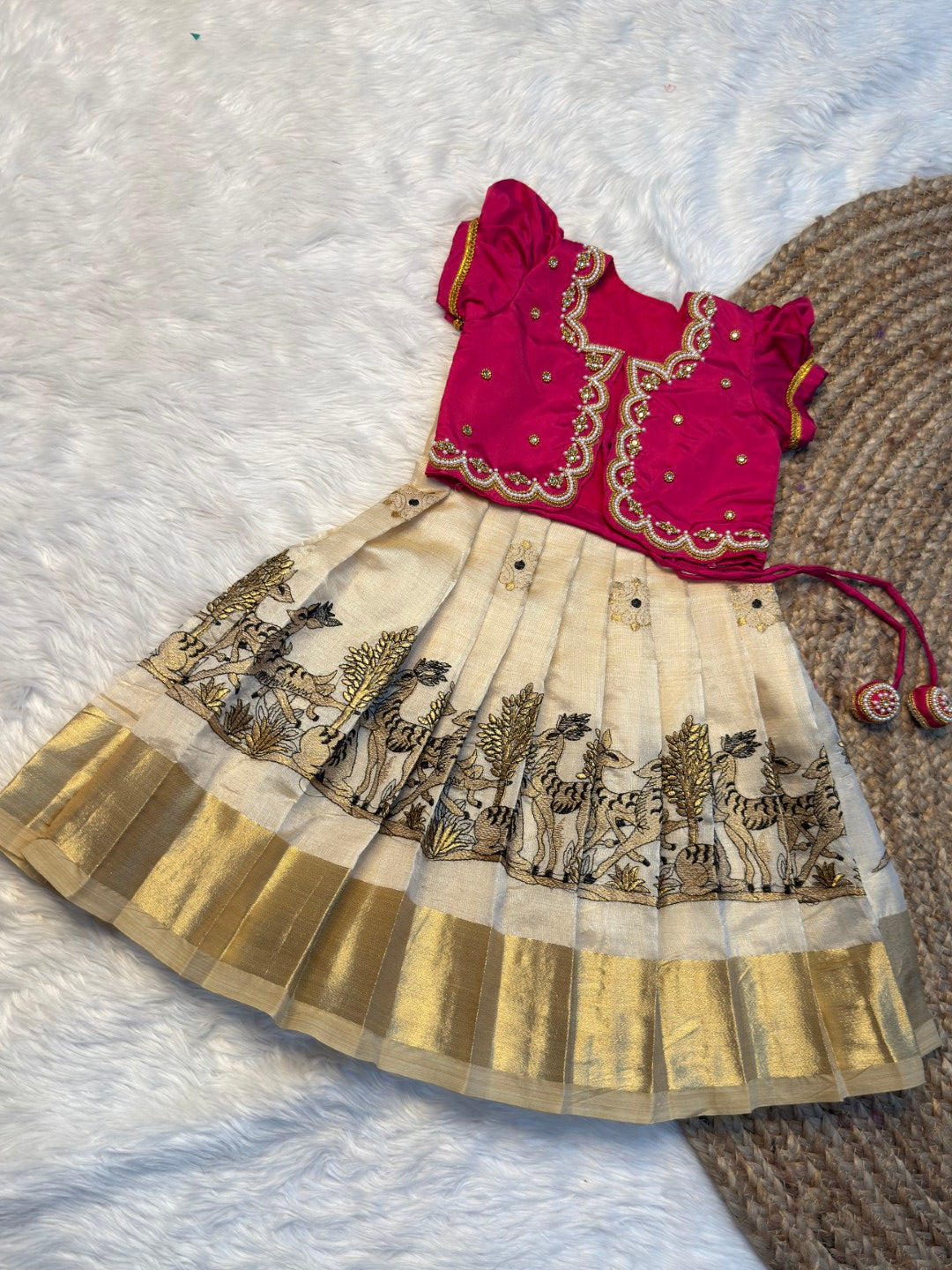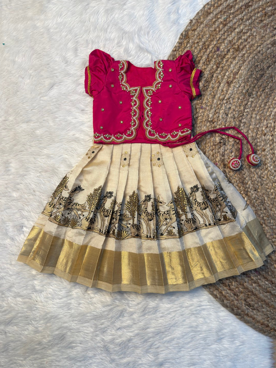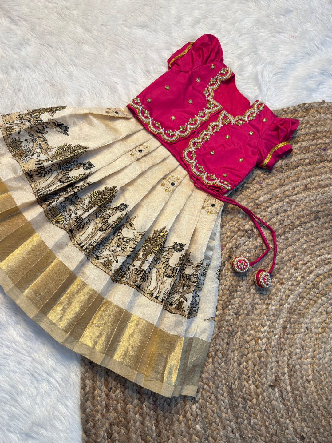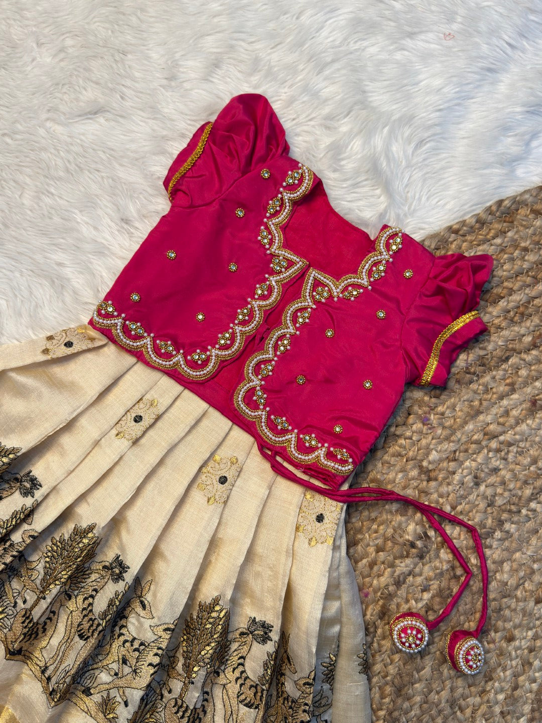 A dreamy pastel combo your little princess will adore! π€©Β Crafted in off-white tissue silk with beautiful embroidery work, this outfit blends grace, comfort, and festive charm.